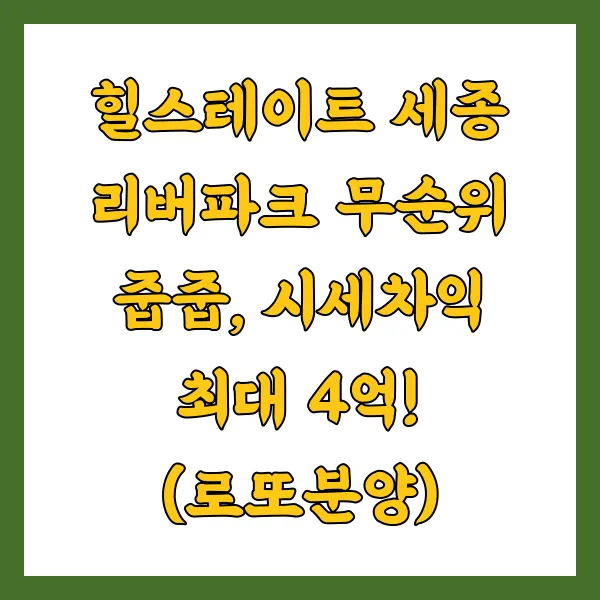세종시 부동산 시장의 뜨거운 감자, 힐스테이트 세종 리버파크의 무순위 줍줍! 로또 분양 이라 불리는 이번 기회, 4억 시세차익의 주인공은 바로 당신이 될 수 있습니다. 놓치면 후회할 핵심 정보와 투자 전략까지, 지금 바로 확인하세요! 세종시 아파트, 힐스테이트 세종 리버파크, 무순위 줍줍, 로또분양 등의 키워드를 중심으로 당신의 성공적인 내 집 마련을 위한 완벽 가이드를 제시합니다.