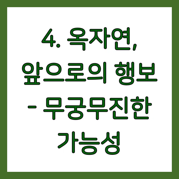 배우 옥자연의 앞으로의 행보는 무궁무진한 가능성으로 가득 차 있습니다. 그녀가 보여줄 새로운 모습과 도전에 대한 기대감은 날로 커져만 갑니다. 연기뿐만 아니라 다양한 분야에서 활약할 그녀의 모습을 기대해 봅니다. 그녀의 끊임없는 성장과 변화를 응원합니다! 앞으로도 그녀의 멋진 활약을 기대하며, 더욱 빛나는 배우로 성장해 나가기를 진심으로 바랍니다!