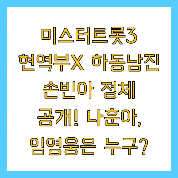 2024년 트로트 오디션계를 뒤흔들 미스터트롯3! 모두를 깜짝 놀라게 한 현역부X의 등장! 베일에 싸인 실력자들의 정체는 과연 누구일까요? 하동남진의 정체로 손빈아가 지목되는 가운데, 울산나훈아, 일산임영웅, 화곡동조용필은 누구일지, 지금 바로 확인하세요! 미스터트롯3, 현역부X, 하동남진, 손빈아, 울산나훈아, 일산임영웅, 화곡동조용필 등 핵심 키워드를 중심으로 흥미진진한 트로트 경연의 세계를 펼쳐봅니다.